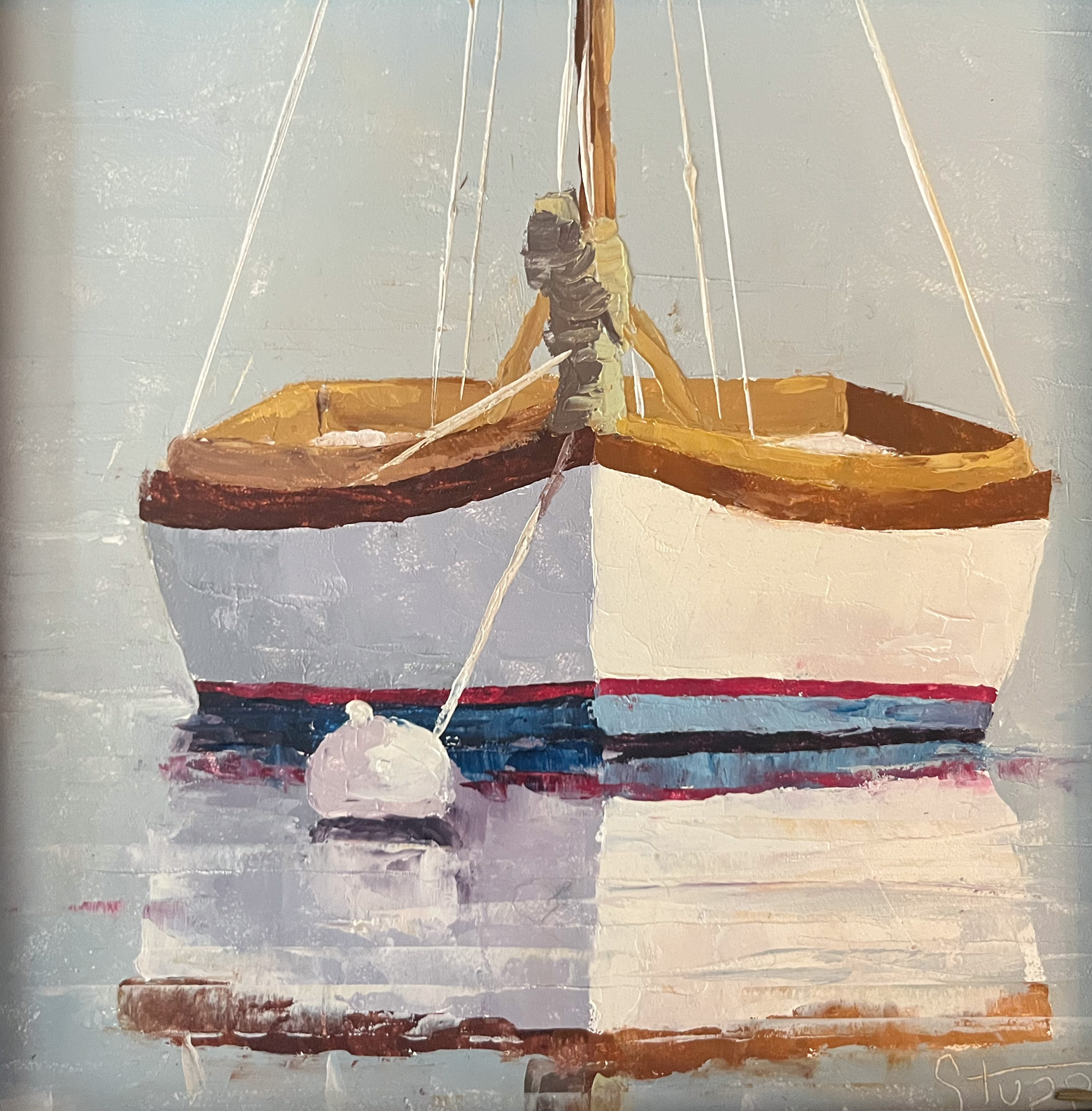 White and Blue Sailboat at Anchor. This painting is done on a 10×10 panel. This is unframed.